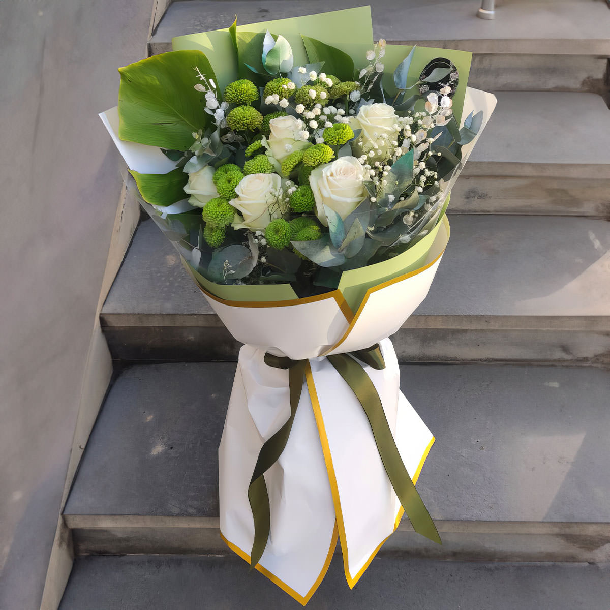 Роза одноголовая белая, хризантема кустовая зеленая, монстера, лунария, гипсофила, эвкалипт. Упаковка (лента, пленка, крафт, сетка, пленка матовая)