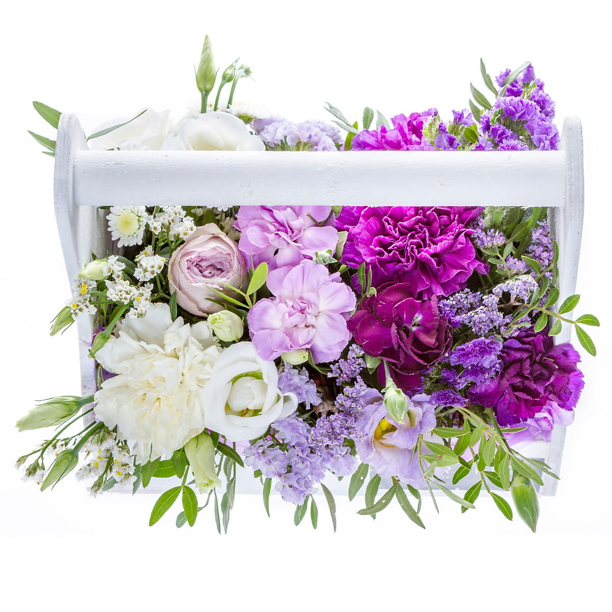 Гвоздика сиреневая и белая, эустома белая, хризантема кустовая белая, статица, фисташка. Упаковка (Корзина, оазис, ящик).